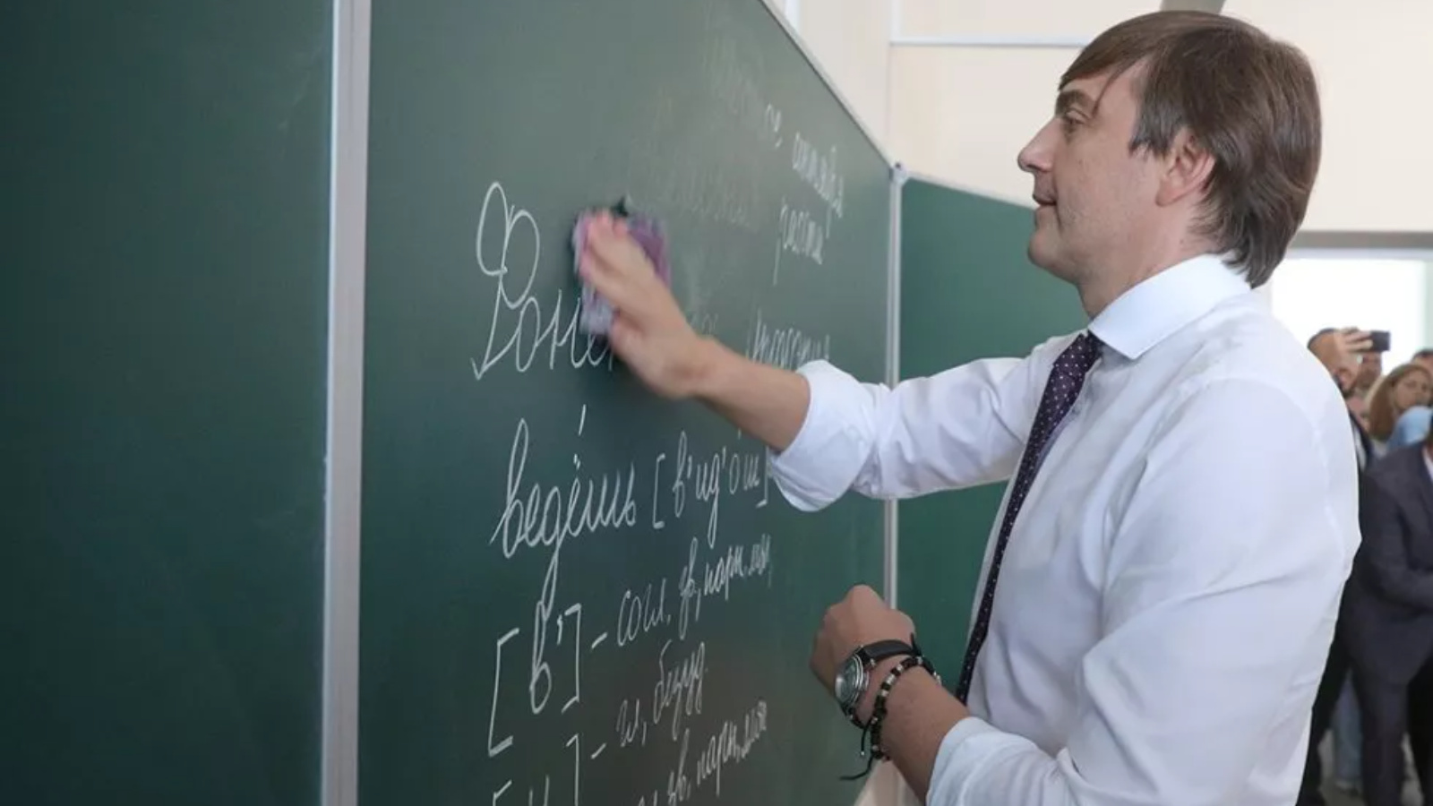 Необычную картину можно было наблюдать в школе №55 Ставрополя. В одном из классов министр просвещения РФ Сергей Кравцов взял в руки тряпку, подошел к доске и принялся стирать написанные на ней предложения. А затем к этой уборке присоединились другие официальные лица.