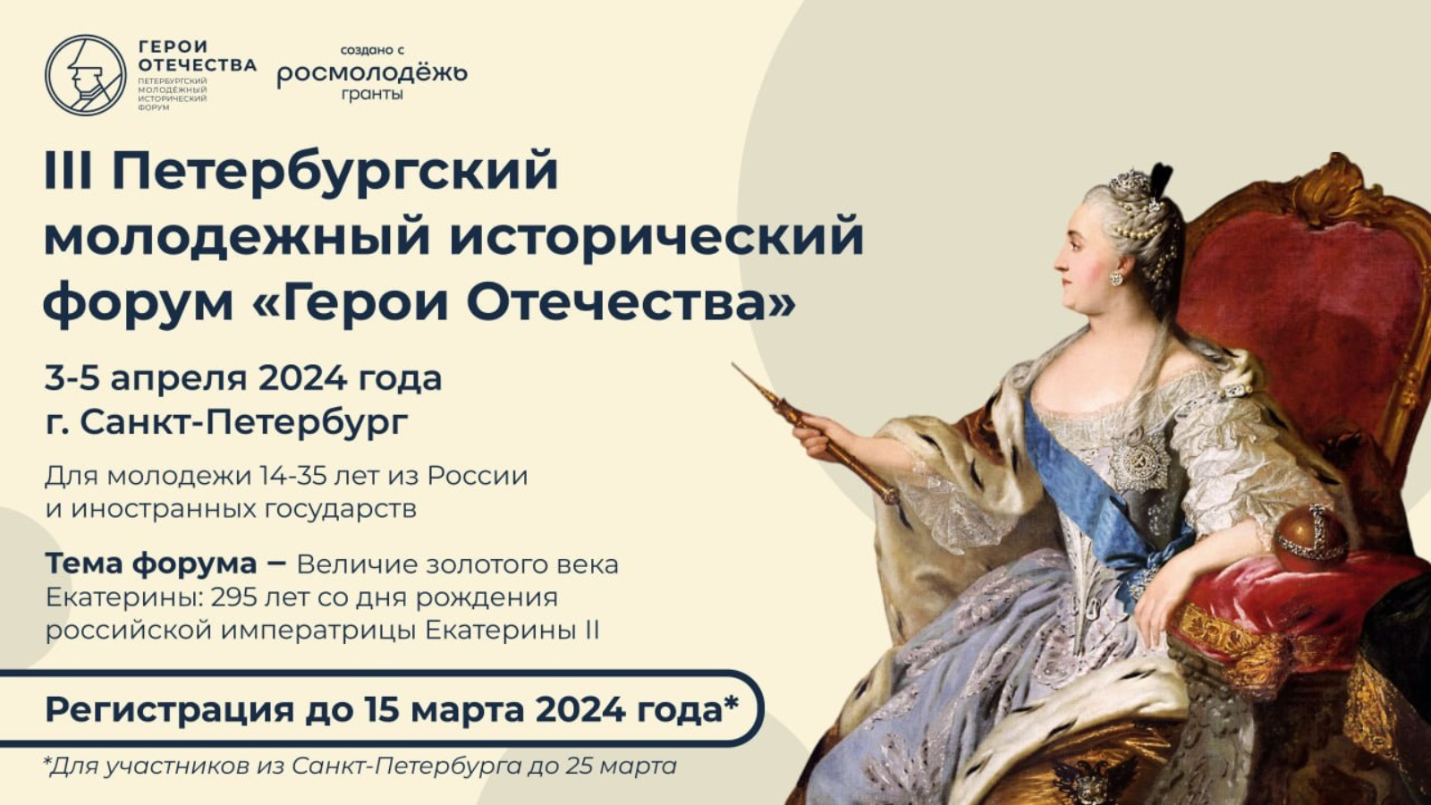 В Санкт-Петербурге 3–5 апреля 2024 года пройдет III Петербургский молодежный исторический форум «Герои Отечества». Основная тема форума – «Величие золотого века Екатерины: 295 лет со дня рождения российской императрицы Екатерины II».