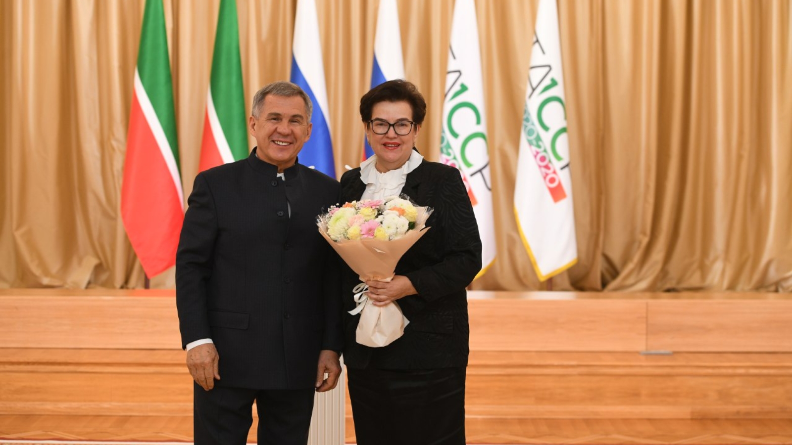 Сәламләү сүзләреннән соң ТР Президенты дәүләт бүләкләре тапшырды. Әйтик, Идел буе дәүләт физкультура, спорт һәм туризм академиясе ректоры вазифаларын башкаручы Рафис Борһанов – Александр Невский ордены, Муса Җәлил исемендәге опера һәм балет театрының вокал буенча репетиторы Винера Ганиева Мактау билгесе ордены белән бүләкләнде.
