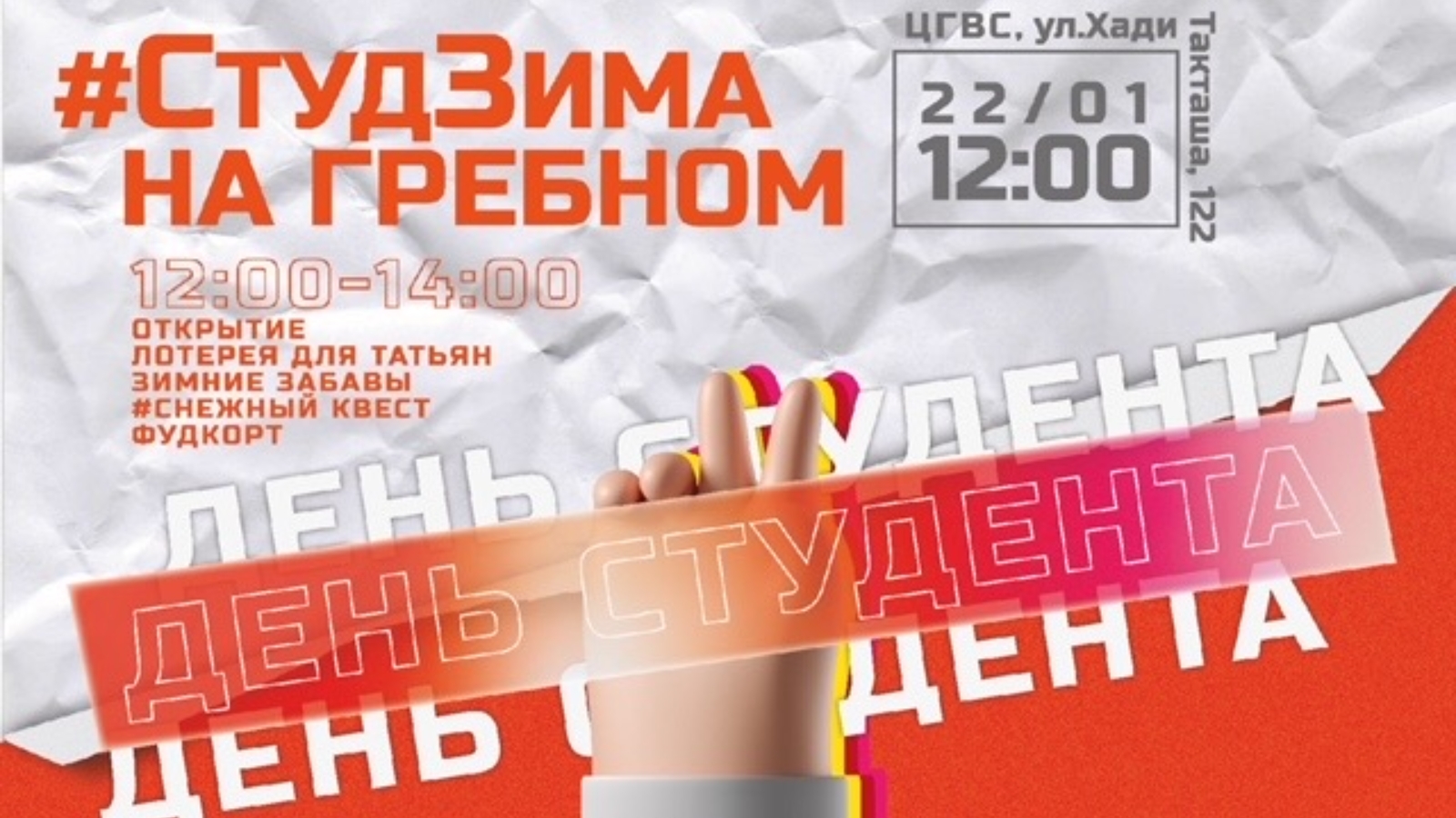 Студентлар бәйрәменә Казан вузлары студентлары, абитуриентлар һәм теләге булган һәркем чакырыла. https://docs.google.com/forms/d/e/1FAIpQLSd856KuHHaxd сайтында теркәлгәннәрне тюбингларда узышлар, Россия чемпионы Виктор Марковтан карда волейбол буенча мастер-класс, Татьяналар өчен лотерея һәм кар-квест көтә. Кайнар чәй һәм карабодай боткасы бәйрәмдә катнашучыларга яхшы кәеф булдырырга һәм туңмаска ярдәм итәчәк. Җылырак киенегез! Барлык сорауларга да Полина Сарвилина җавап бирәчәк: https://vk.com/vpelageyaa
