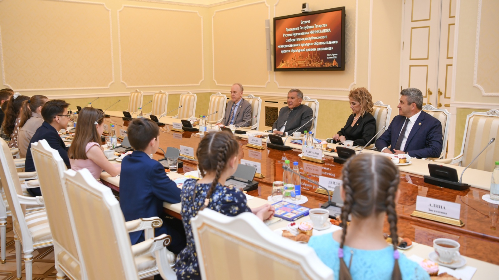 Бүген Татарстан Республикасы Президенты Рөстәм Миңнеханов "Укучының мәдәни көндәлеге" республика мәдәни-белем бирү проектында җиңүчеләр белән очрашты.