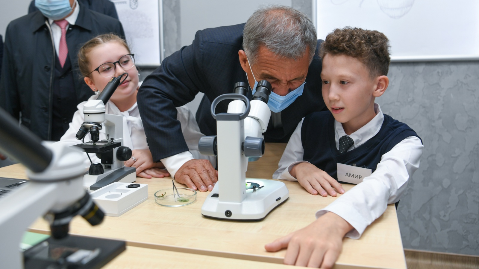 Бүген Әлмәткә эш сәфәре кысаларында Татарстан Республикасы Президенты Рөстәм Миңнеханов һәм Татарстан Республикасы Дәүләт Киңәшчесе Минтимер Шәймиев 1 нче урта гомуми белем бирү мәктәбендә булдылар һәм яңа уникаль биолабораторияне карадылар.