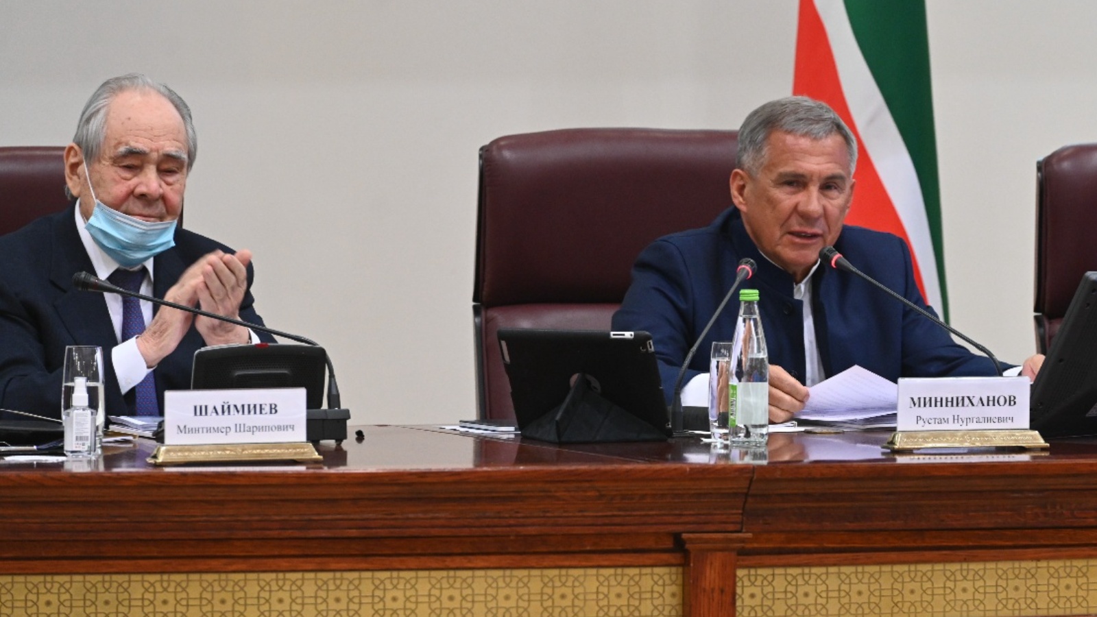 "Барыннан да элек, без илкүләм лидерыбыз Владимир Владимирович Путинга рәхмәт әйтергә тиеш. Минтимер Шәрип улы Шәймиев аңа рухи ядкарьләрне торгызу тәкъдиме белән мөрәҗәгать иткәч, әлеге инициатива мораль яктан гына хупланып калмыйча, федераль бюджет аша финанс яктан да ныгытылды. Татарстан Республикасының беренче Президенты Минтимер Шәрип улына да аерым рәхмәт", - дип ассызыклады Рөстәм Миңнеханов.