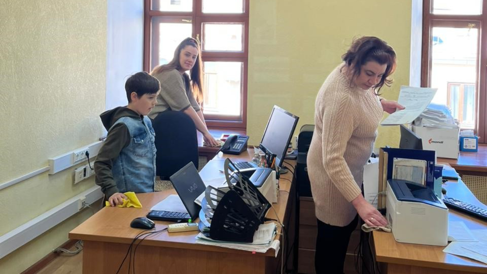 Алар бина тирәсен тәртипкә китерделәр, тәрәзәләрне юдылар, үзләренең эш урыннарында җыештырдылар. Кайбер балалар да, әти-әниләренә Министрлык территориясен төзекләндерүдә һәм тәртип урнаштыруда катнашуда ярдәм итәргә килделәр.