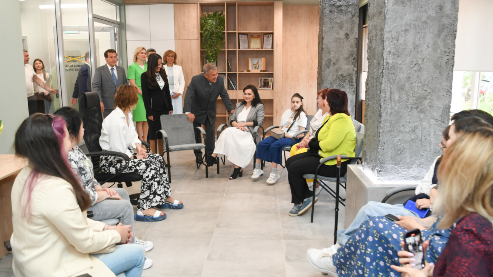 Татарстан Рәисен ТР хезмәт, мәшгульлек һәм социаль яклау министры Эльмира Зарипова, ТР мәгариф һәм фән министры Илсур Һадиуллин, ТРда бала хокуклары буенча вәкил Ирина Волынец һәм Казан мэры Илсур Метшин озата йөрде.