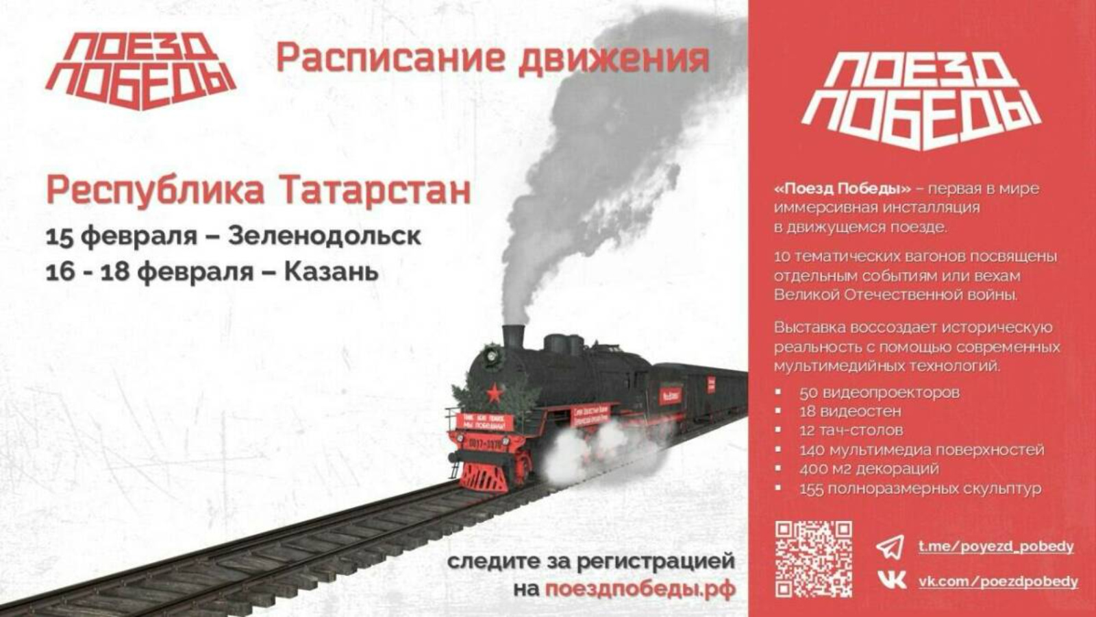 "Җиңү поезды" исемле күчмә күргәзмә Татарстанга киләчәк. 15 февральдә, күргәзмәдә Яшел Үзән хезмәт батырлыгы шәһәре халкы һәм кунаклары катнаша алачак. Шуннан соң, 16-18 февральдә, Казанда яшәүчеләр һәм Казан кунаклары карый алачак.