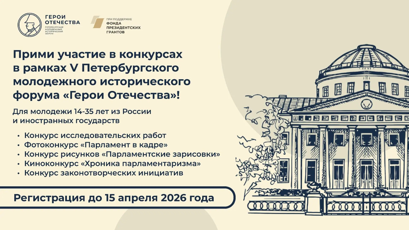 15 апрельгә кадәр мәктәп укучылары, көллият һәм югары уку йортлары студентлары, шулай ук 14 яшьтән 35 яшькә кадәрге яшь галимнәр «Ватан геройлары» V Петербург яшьләр тарихи форумы кысаларында конкурсларда катнаша ала. Чара май аенда Санкт-Петербургта узачак.